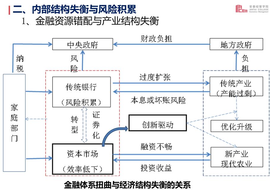 这张图大家可以重点关注,因为我们的金融扭曲,我们的资金融通70%-80%通过银行中介。银行通过抵押品把资金给到了重资产行业,制造业、房地产、基础设施有抵押的。这些领域借助杠杆和负债出现了过度的扩张,严重过剩。所以在这张图当中上半部分银行和传统行业,就是“冰冷的领域”,产能过剩严重,未来要需要通过重组、淘汰和收缩。