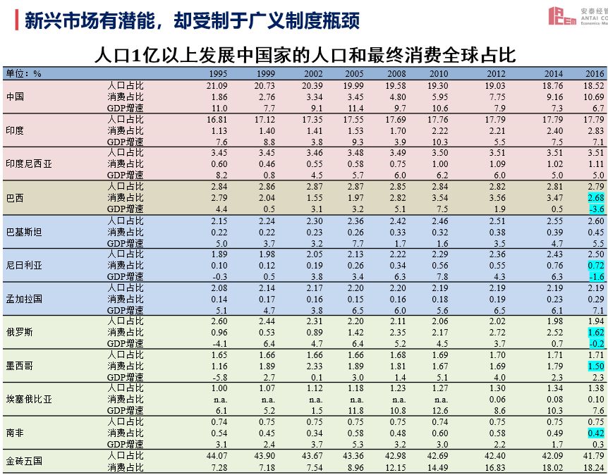 新兴市场是有潜力的,但是受制于广义的制度瓶颈。这里我们列出了人口在1亿以上的发展中国家,实际上全球人口在1亿以上的国家只有13个,这里有11个,再加上美国和日本。这里我称之为“C+2”的中国、印度和印度尼西亚三国人口接近全球的40%。中国消费比例从2002年的3.34%,现在增加到10.69%,印度和印度尼西亚也都增长了1倍,可以看到这些国家的市场是有潜力的。但是新兴市场国家仍然会有一些风险。