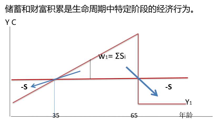 这张图是非常简单的一个理论叫生命周期消费理论,我们的收入随着年龄增加而增长,退休之后工作收入大幅度下降。我们消费应该是怎么样的呢?一生稳定的消费是福利最大化的,储蓄是收入线到消费线垂直的距离,就是当年收入扣掉消费的剩余部分,相当于农民家里的“余粮”,这是储蓄的概念。年轻的时候负储蓄。