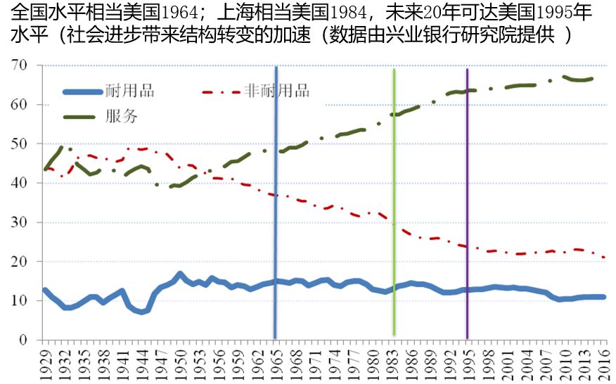 未来往哪里发展?这张图是兴业银行鲁政委他们的研究成果,他们讨论了中国未来消费结构变化,借鉴了美国的以往的相关数据。在美国80余年消费结构数据变化图上,他们添加了两条垂直线,一条表明中国全国消费结构目前相当于美国1960年代中期水平。另一条表示上海消费结构相当于美国80年代中期。