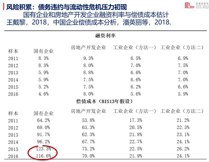 产能过剩带来的问题就是债务风险积累,这张表是我主持的一个论文集中王戴黎做的研究。他用企业的偿债成本(当年需还的本金和利益)跟企业的可支配收入做比较。息税折旧摊销前收益,我们称之为可支配收入。偿债成本与可支配收入的比例2015年是最高的,国有企业已经达到了123%,那么还本付息数额已经达到了收入的123%,怎么没有出现违约?假设本金不要偿还,利息支付比例就下降到43%。