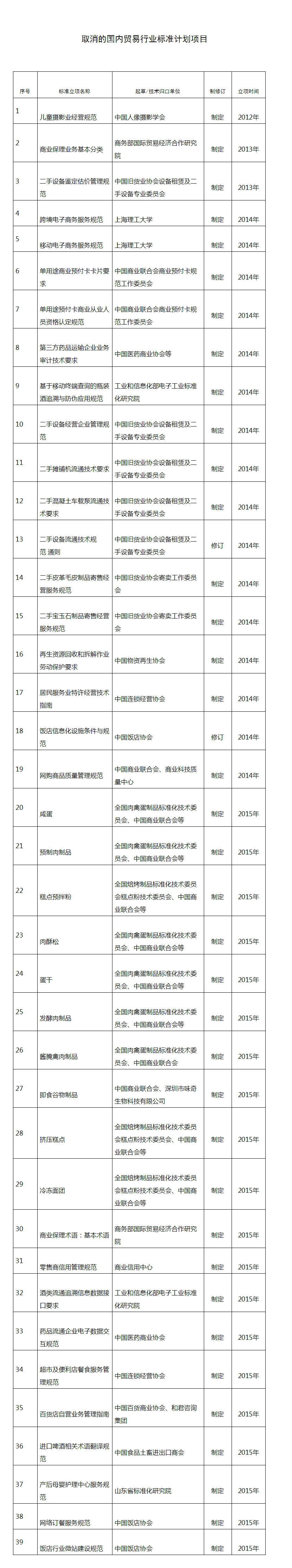 (原题为《商务部取消39项国内贸易行业标准计划项目》)